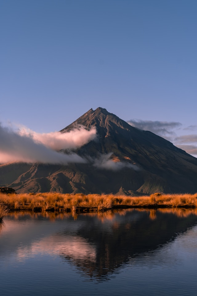 O icônico Monte Taranaki, um vulcão de simetria perfeita, é cercado por florestas exuberantes e trilhas cênicas para experiências de trekking de alto padrão.